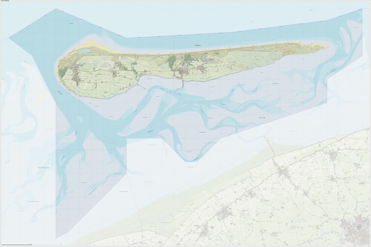 Gemeentekaart Ameland, volgens de veelgebruikte TopoPlus-opmaak. Peildatum: juni 2023.