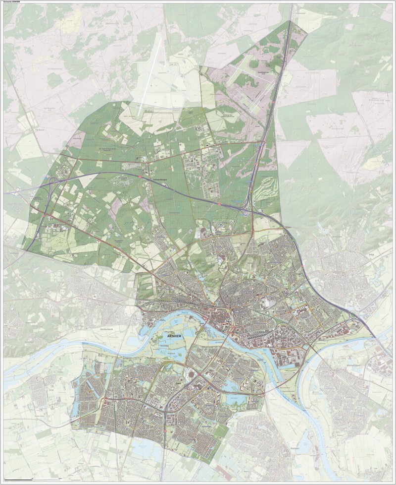 Gemeentekaart Arnhem, volgens de veelgebruikte TopoPlus-opmaak. Peildatum: juni 2023.