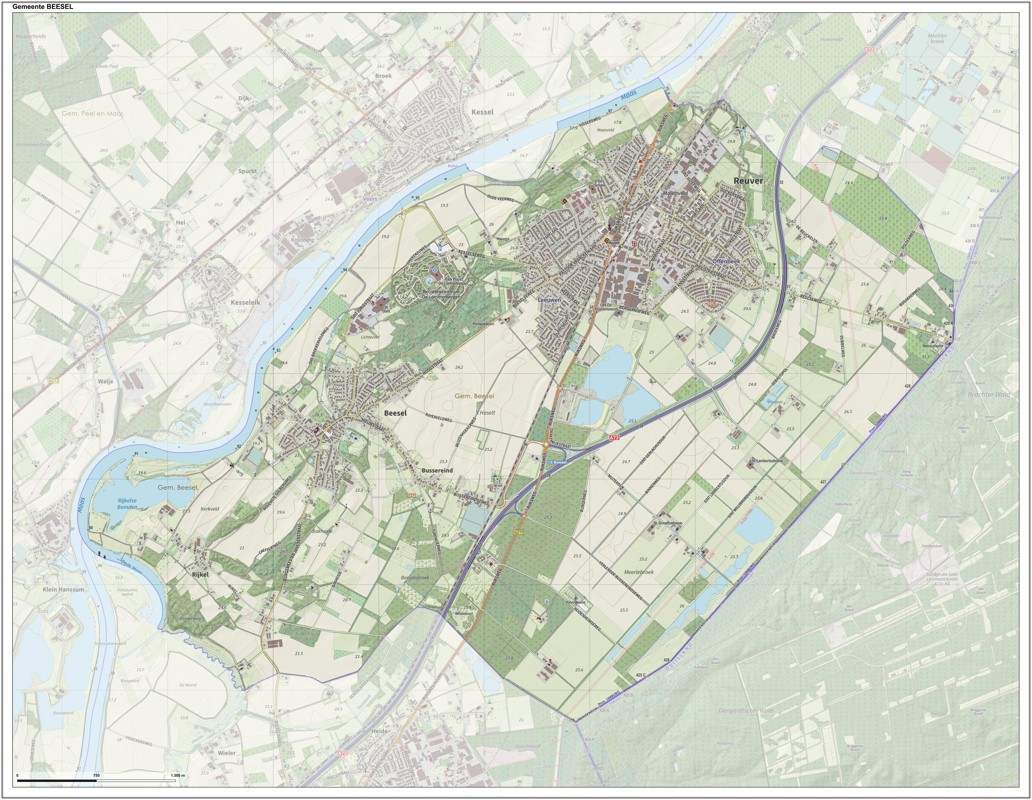 Gemeentekaart Beesel, volgens de veelgebruikte TopoPlus-opmaak. Peildatum: juni 2023.