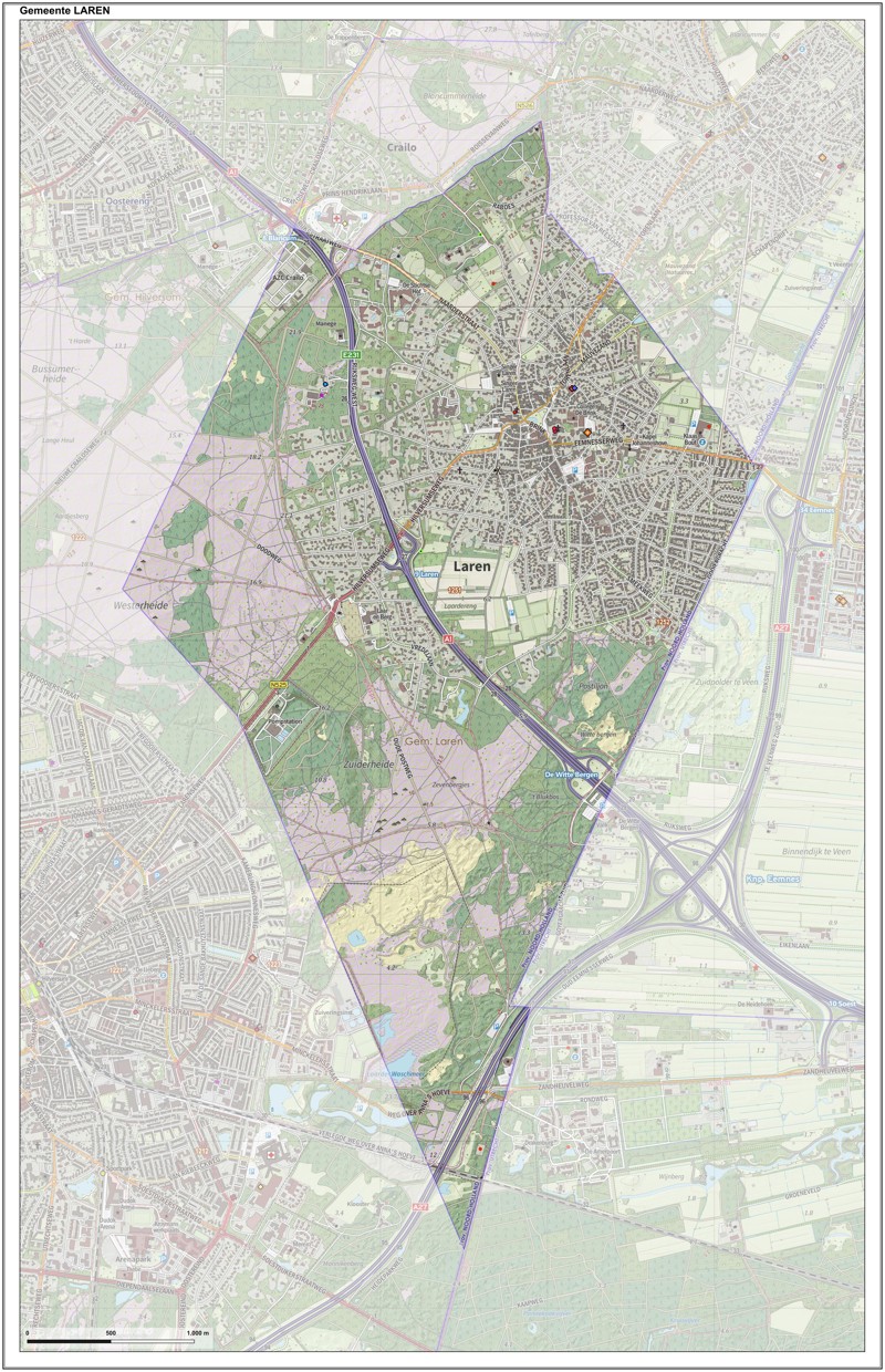 Gemeentekaart Laren, volgens de veelgebruikte TopoPlus-opmaak. Peildatum: juni 2023.