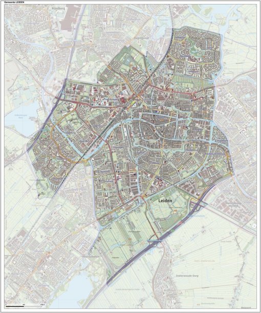 Gemeentekaart Leiden, volgens de veelgebruikte TopoPlus-opmaak. Peildatum: juni 2023.