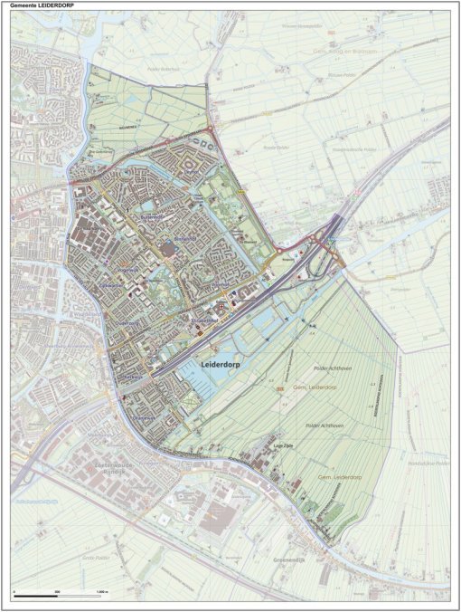Gemeentekaart Leiderdorp, volgens de veelgebruikte TopoPlus-opmaak. Peildatum: juni 2023.