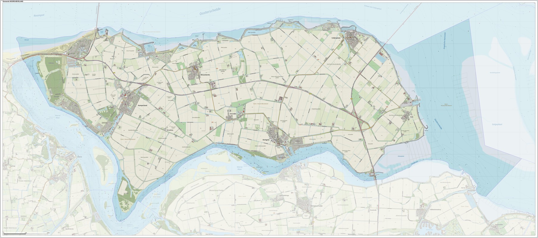 Gemeentekaart Noord-Beveland, volgens de veelgebruikte TopoPlus-opmaak. Peildatum: juni 2023.