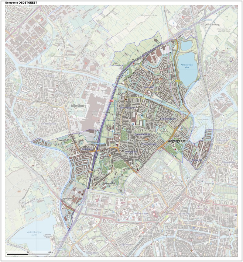 Gemeentekaart Oegstgeest, volgens de veelgebruikte TopoPlus-opmaak. Peildatum: juni 2023.