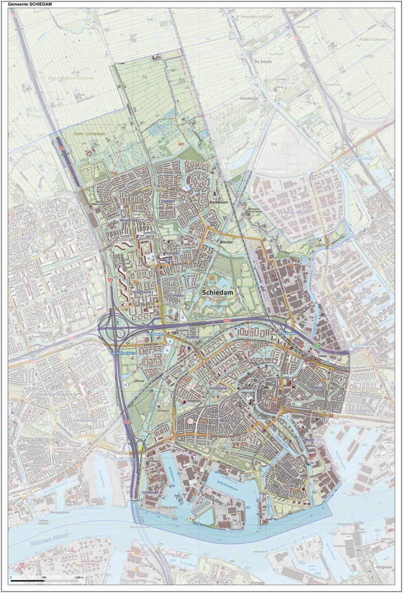 Gemeentekaart Schiedam, volgens de veelgebruikte TopoPlus-opmaak. Peildatum: juni 2023.