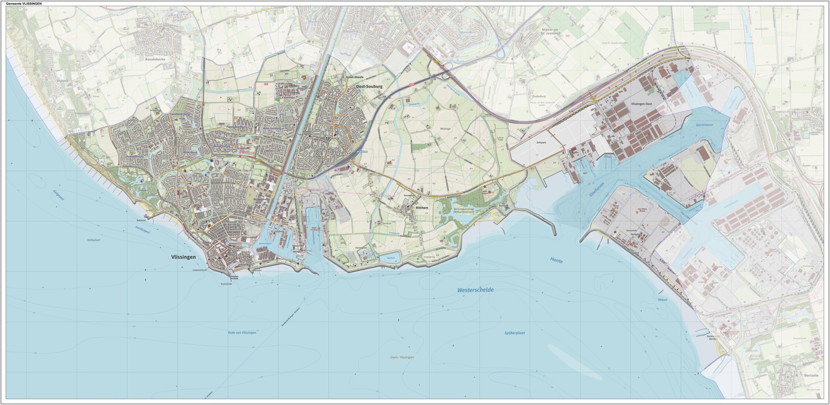 Gemeentekaart Vlissingen, volgens de veelgebruikte TopoPlus-opmaak. Peildatum: juni 2023.