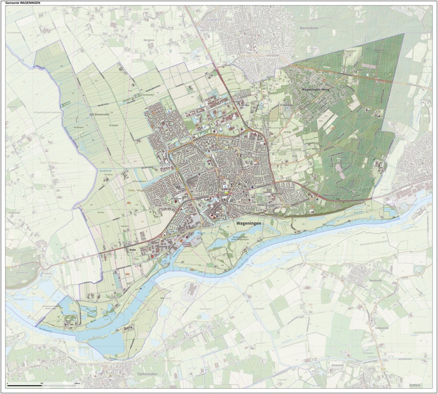Gemeentekaart Wageningen, volgens de veelgebruikte TopoPlus-opmaak. Peildatum: juni 2023.