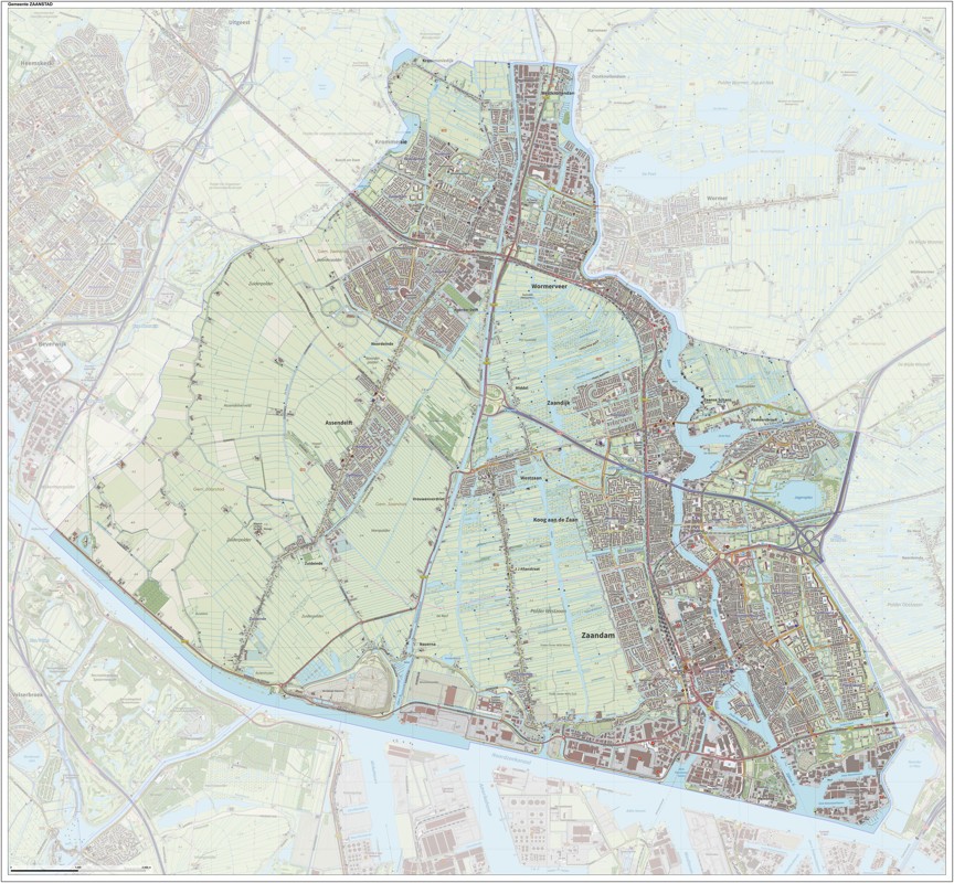 Gemeentekaart Zaanstad, volgens de veelgebruikte TopoPlus-opmaak. Peildatum: juni 2023.