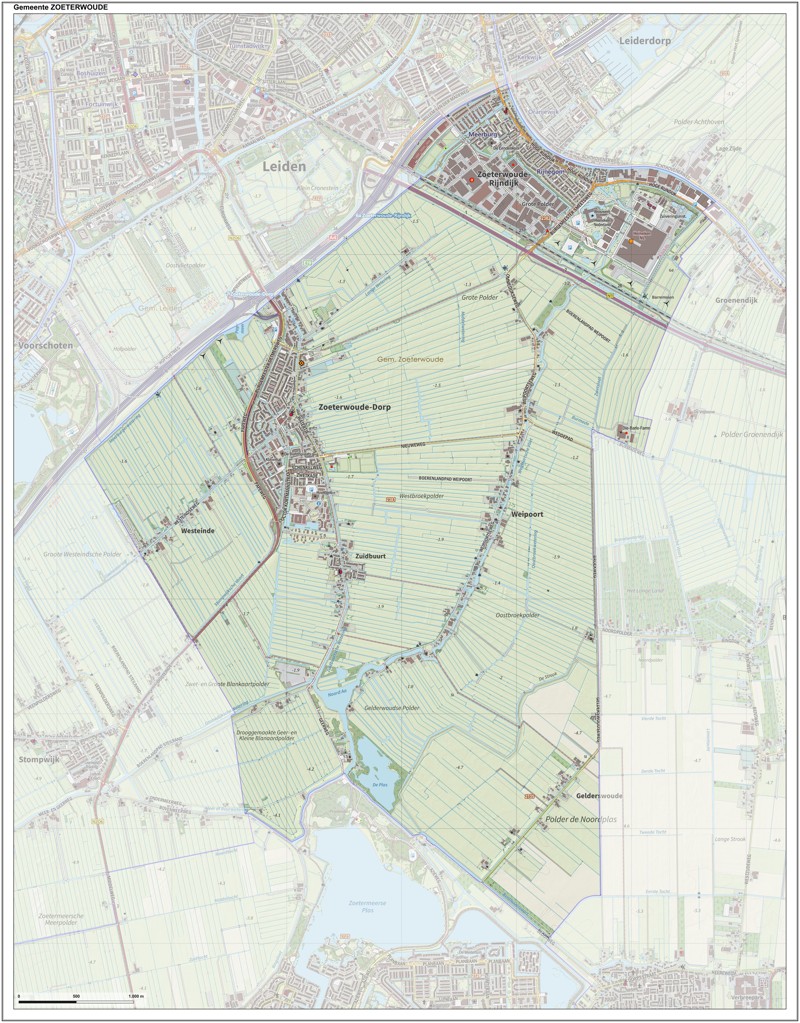 Gemeentekaart Zoeterwoude, volgens de veelgebruikte TopoPlus-opmaak. Peildatum: juni 2023.