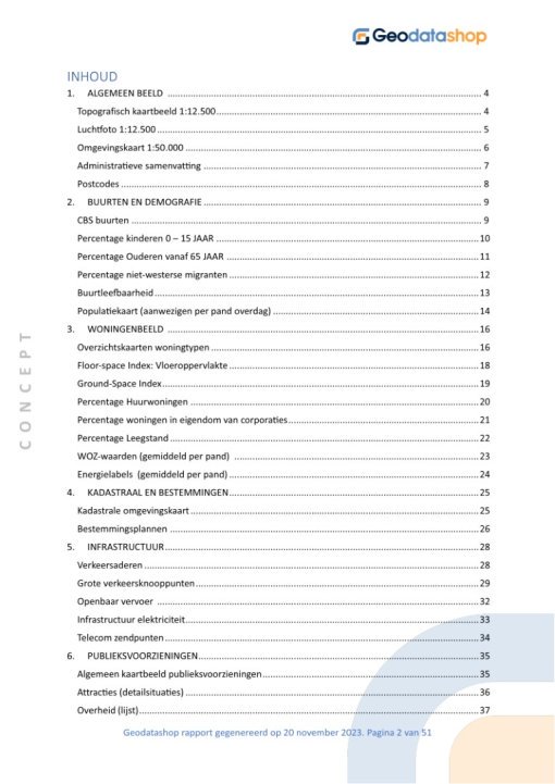 Het Omgevingsrapport van Geodatashop.nl is ontworpen om deze datasilo’s te doorbreken. Het is ons meest uitgebreide rapport dat u een compleet, 360-graden beeld geeft van elke locatie in Nederland.