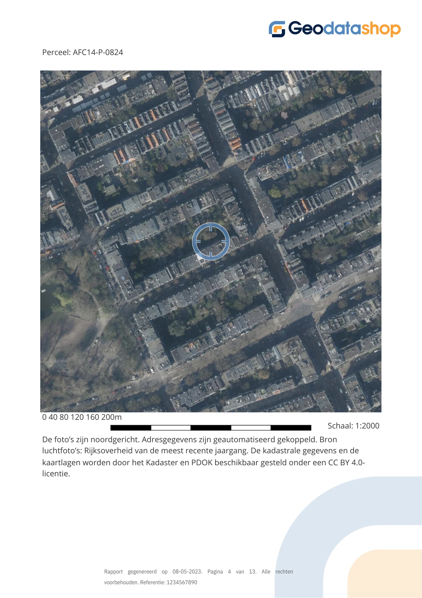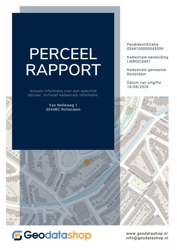 Naast het kadastraal perceelnummer, biedt het rapport ook informatie over de maaiveldhoogte, basisgegevens over het pand (of panden) op het perceel, en verwijzingen naar bestemmingsplannen. Bovendien krijgt u inzicht in speciale activiteiten, zoals alle Handelsregister vermeldingen op dit perceel, de buurtleefbaarheid, en zelfs historische topografie van de omgeving.